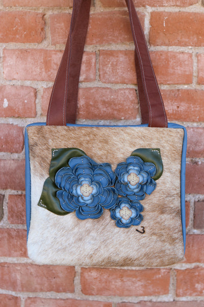 Cowhide Travel Case with Leather Sides and Leather Flowers and Leaves.