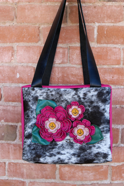 Cowhide Travel Case with Leather Sides and Leather Flowers and Leaves.