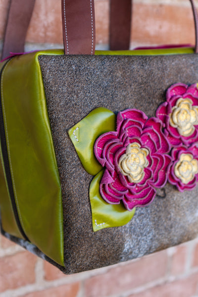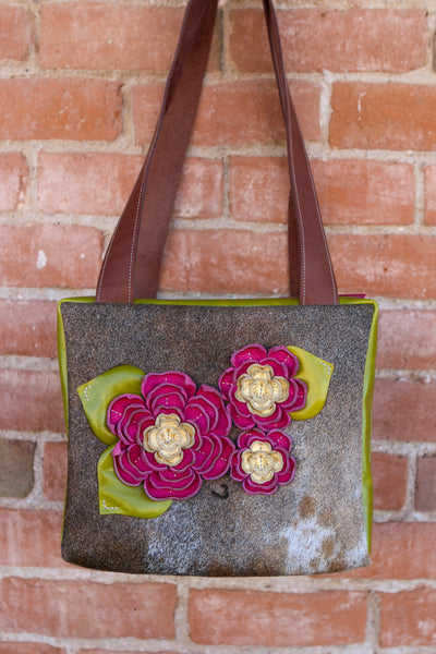 Cowhide Travel Case with Leather Sides and Leather Flowers and Leaves.