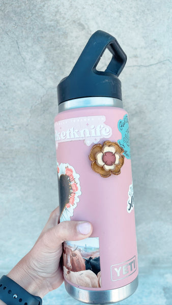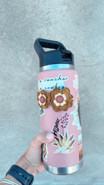 These come in a few different sizes! Once you purchase the sizes you want, I will text you to confirm colors! The best way to do this is have screenshots of the colors/combos you want! Glue is provided with your order to attach to your bottle! We figured out which glue is the most durable and won't ruin your water bottle if you ever want to remove the flower or changeout colors! You CAN purchase multiple sizes to create a cluster effect!